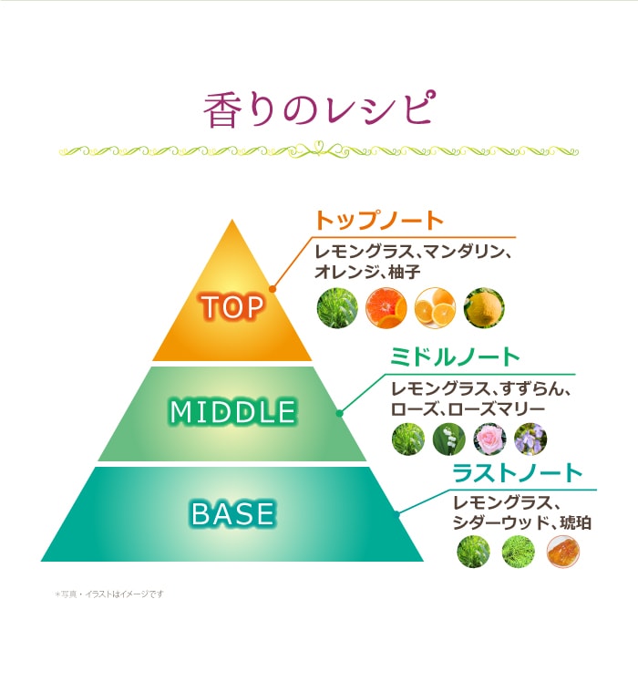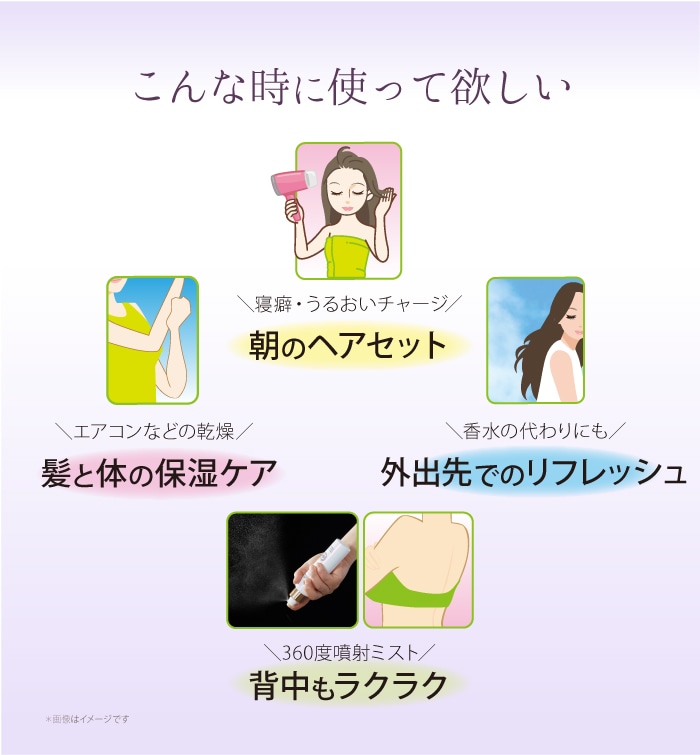 髪や肌から20cmほど離してスプレーしてください。お出かけ前や入浴後リフレッシュしたい時など、軽い香水代わりとしてもお使いいただけます。