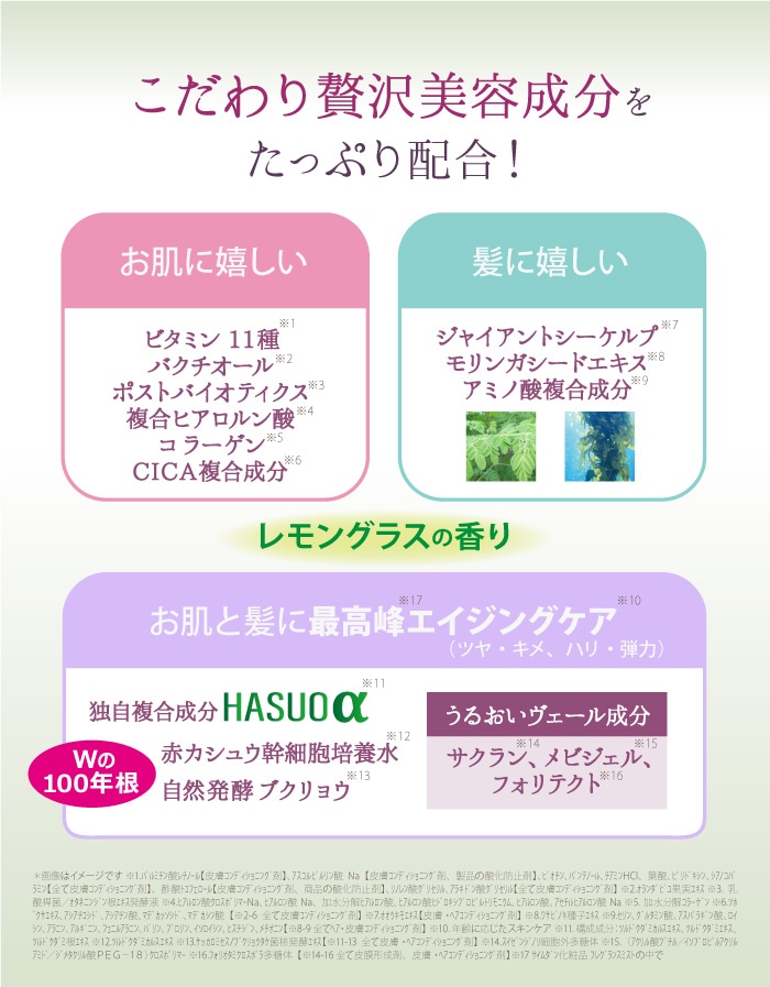 水、変性アルコール、BG、1,2−ヘキサンジオール、PEG−60水添ヒマシ油、ツルドクダミカルスエキス、ツルドクダミエキス、ツルドクダミ根エキス、サッカロミセス/ブクリョウタケ菌核発酵エキス、サッカロミセス/(ハマスゲ根/ホオノキ樹皮/ボタン根/モモ核)発酵エキス液、オランダビユ果実エキス、乳酸桿菌/オタネニンジン根エキス発酵液、ヒアルロン酸クロスポリマーNa、ヒアルロン酸Na、加水分解ヒアルロン酸、ヒアルロン酸ヒドロキシプロピルトリモニウム、ヒアルロン酸、アセチルヒアルロン酸Na、加水分解コラーゲン、加水分解ムコ多糖、パルミチン酸レチノール、アスコルビルリン酸Na、ビオチン、パンテノール、チアミンHCl、葉酸、ピリドキシン、シアノコバラミン、酢酸トコフェロール、リノレン酸グリセリル、アラキドン酸グリセリル、オオウキモエキス、デュナリエラサリナエキス、ツボクサエキス、アシアチコシド、アシアチン酸、マデカッソシド、マデカシン酸、スイゼンジノリ細胞外多糖体、(アクリル酸ブチル/イソプロピルアクリルアミド/ジメタクリル酸PEG−18)クロスポリマー、フォリオタミクロスポラ多糖体、ワサビノキ種子エキス、クロイゲ葉エキス、β−グルカン、オニノダケ根エキス、カンゾウ根エキス、タイツリオウギ根エキス、スイカズラ花エキス、セリン、グルタミン酸、アスパラギン酸、ロイシン、アラニン、アルギニン、フェニルアラニン、バリン、プロリン、イソロイシン、ヒスチジン、メチオニン、ダマスクバラカルス培養エキス、加水分解アカシアマクロスタチア種子エキス、ショウヨウダイオウ根エキス、水添レシチン、ルビー末、メラニン、ベンジリデンジメトキシジメチルインダノン、マルトデキストリン、グリシン、オルニチン、グリセリン、ペンチレングリコール、エチルヘキシルグリセリン、ヤシ油脂肪酸PEG−7グリセリル、ステアリン酸ポリグリセリル−10、(カプリル酸/カプリン酸)PEG−6グリセリズ、クエン酸Na、クエン酸、プロパンジオール、ベンジルグリコール、安息香酸Na、フェノキシエタノール、タウリン、香料